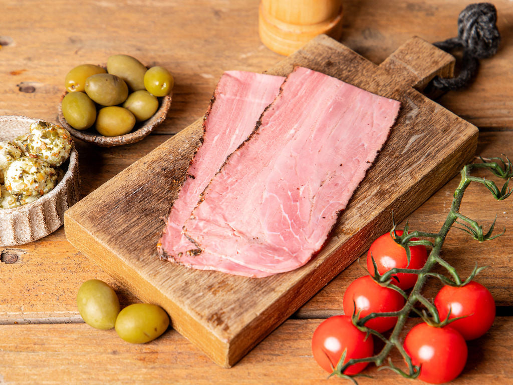 Régalez-vous avec notre Pastrami halal au poivre noir, préparé à base de boeuf certifié halal et parfaitement épicé, ce qui lui confère un parfum raffiné et unique.