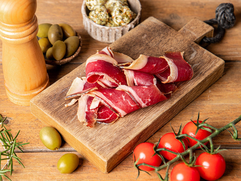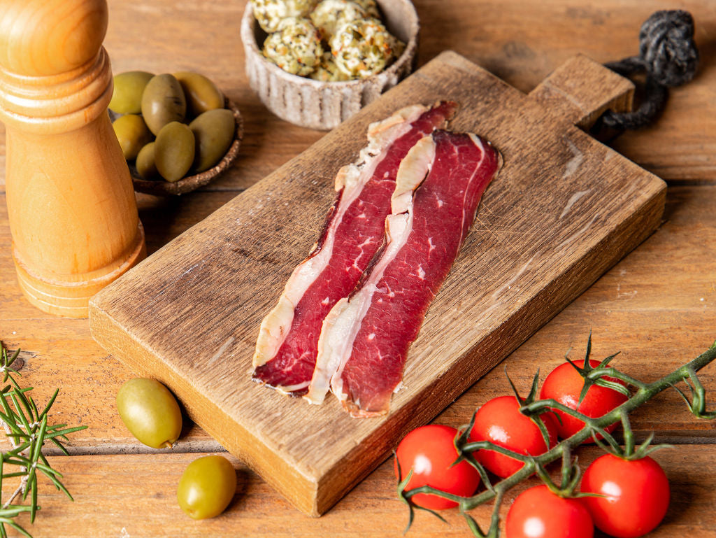 Nous vous invitons à (re)découvrir sans plus attendre un délicieux classique de la charcuterie italienne: le jambon cru, obtenu à partir de boeuf certifié halal séché à froid, parfumé aux arômes naturels et enfin fumé au bois de hêtre.